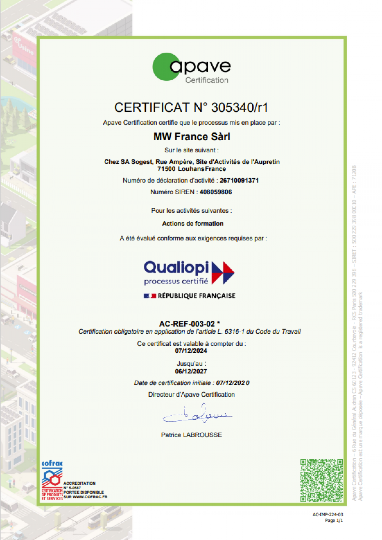 MW Programmation SA est certifiée Qualiopi pour ses actions de formation. Cette certification, délivrée par un organisme accrédité, atteste de la qualité de nos processus de formation : organisation, pédagogie, accompagnement, suivi et satisfaction des participants.